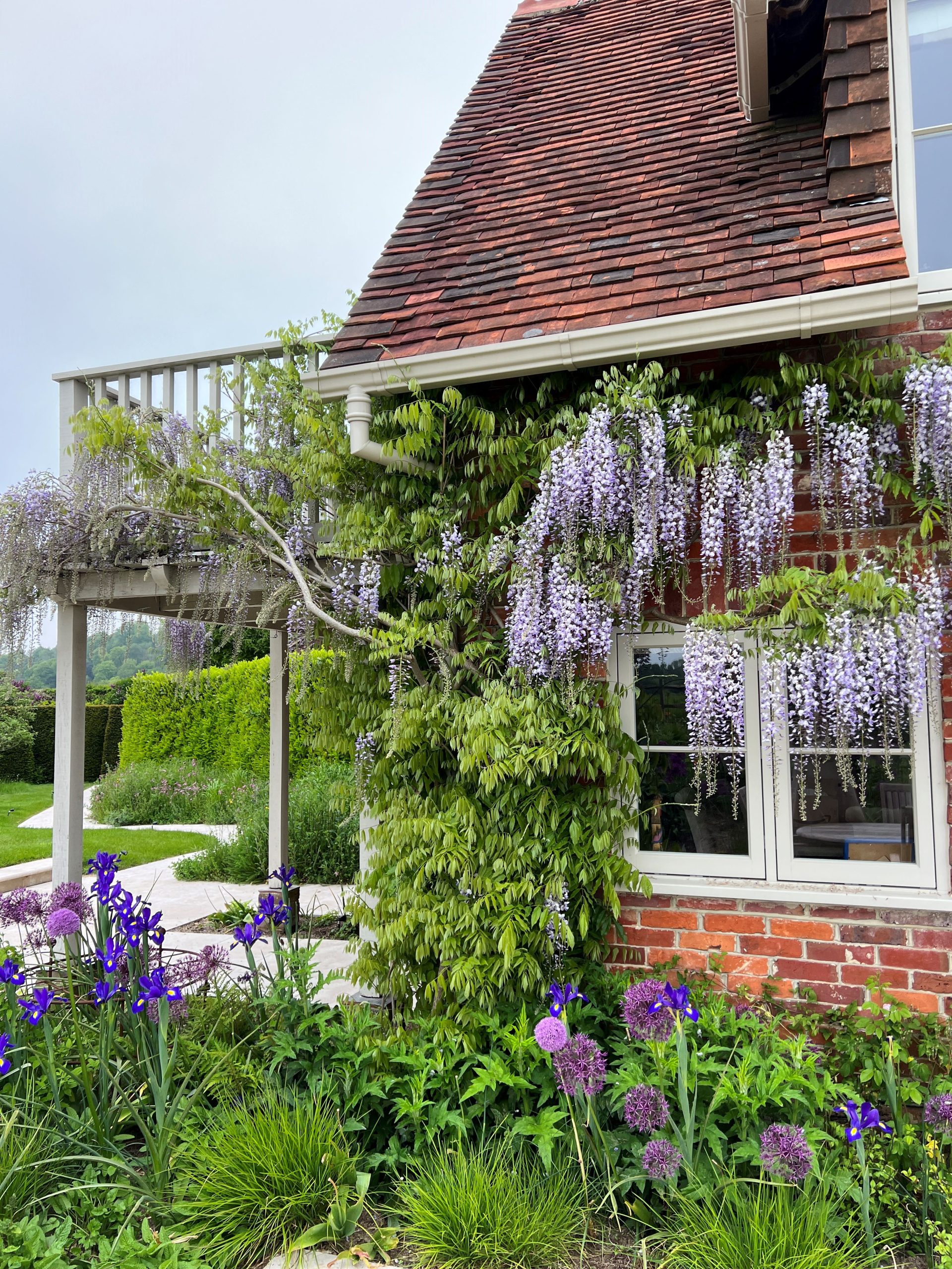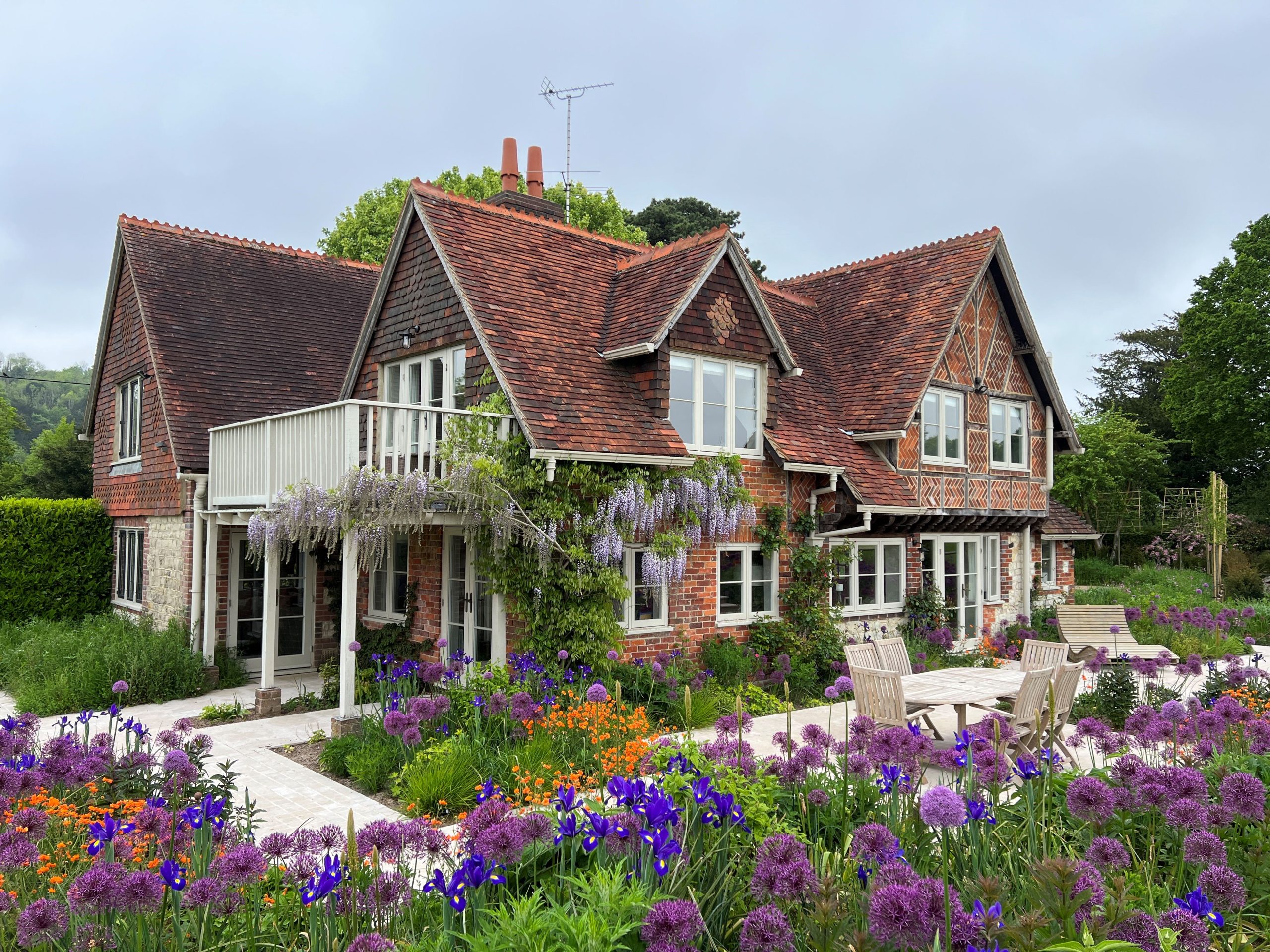 Imagine a charming countryside cottage, its character defined by exposed wooden beams, warm red brick in a classic herringbone pattern, and the delicate fragrance of wisteria climbing the walls and balcony. The balcony, a peaceful retreat, perfect for enjoying a morning coffee or watching the sun set over the landscaped garden. This idyllic setting is home to Louise and Kevin.
