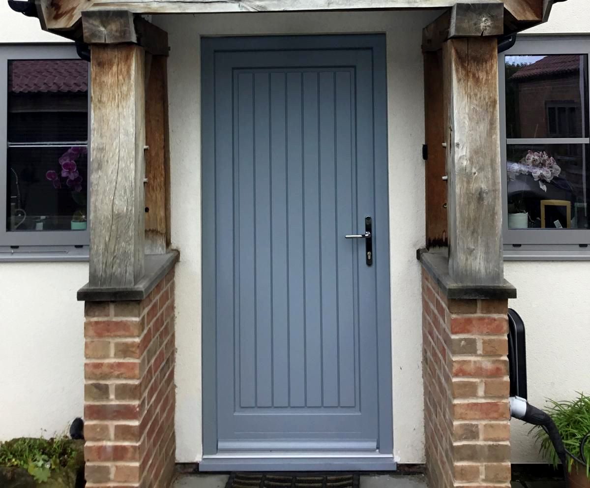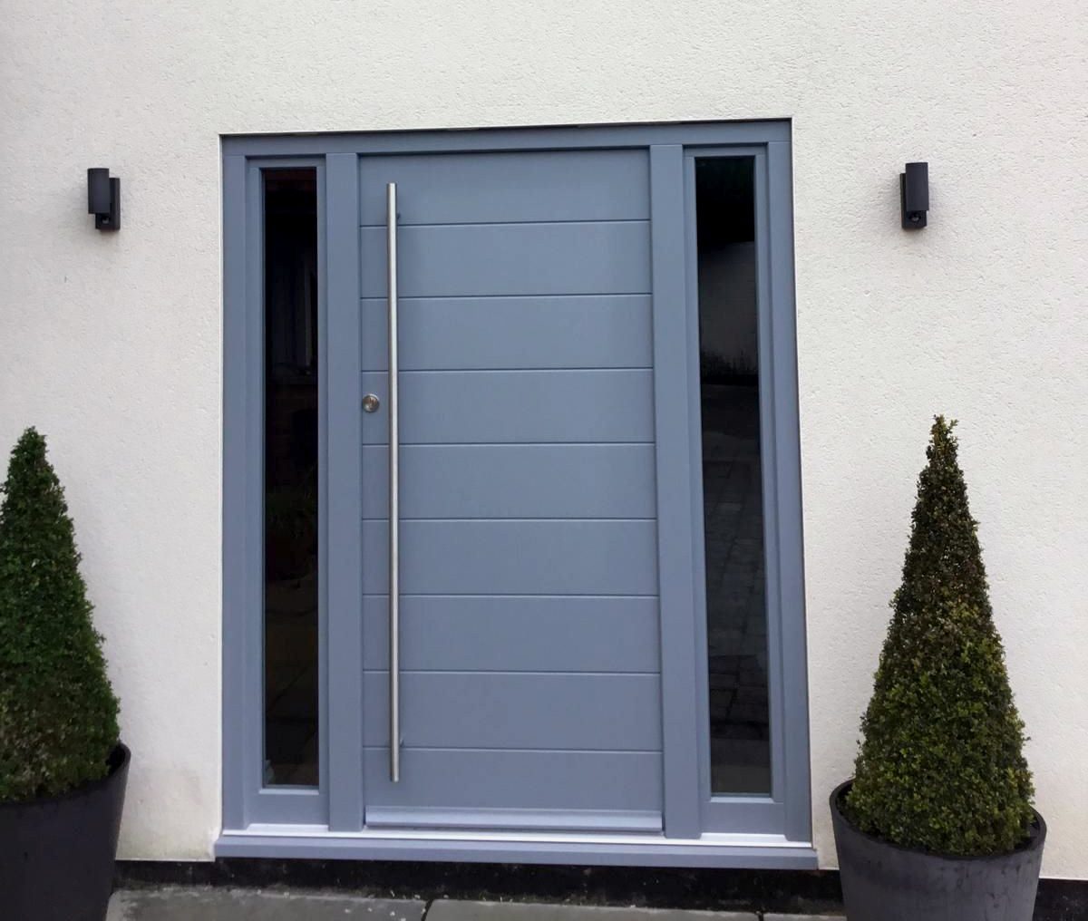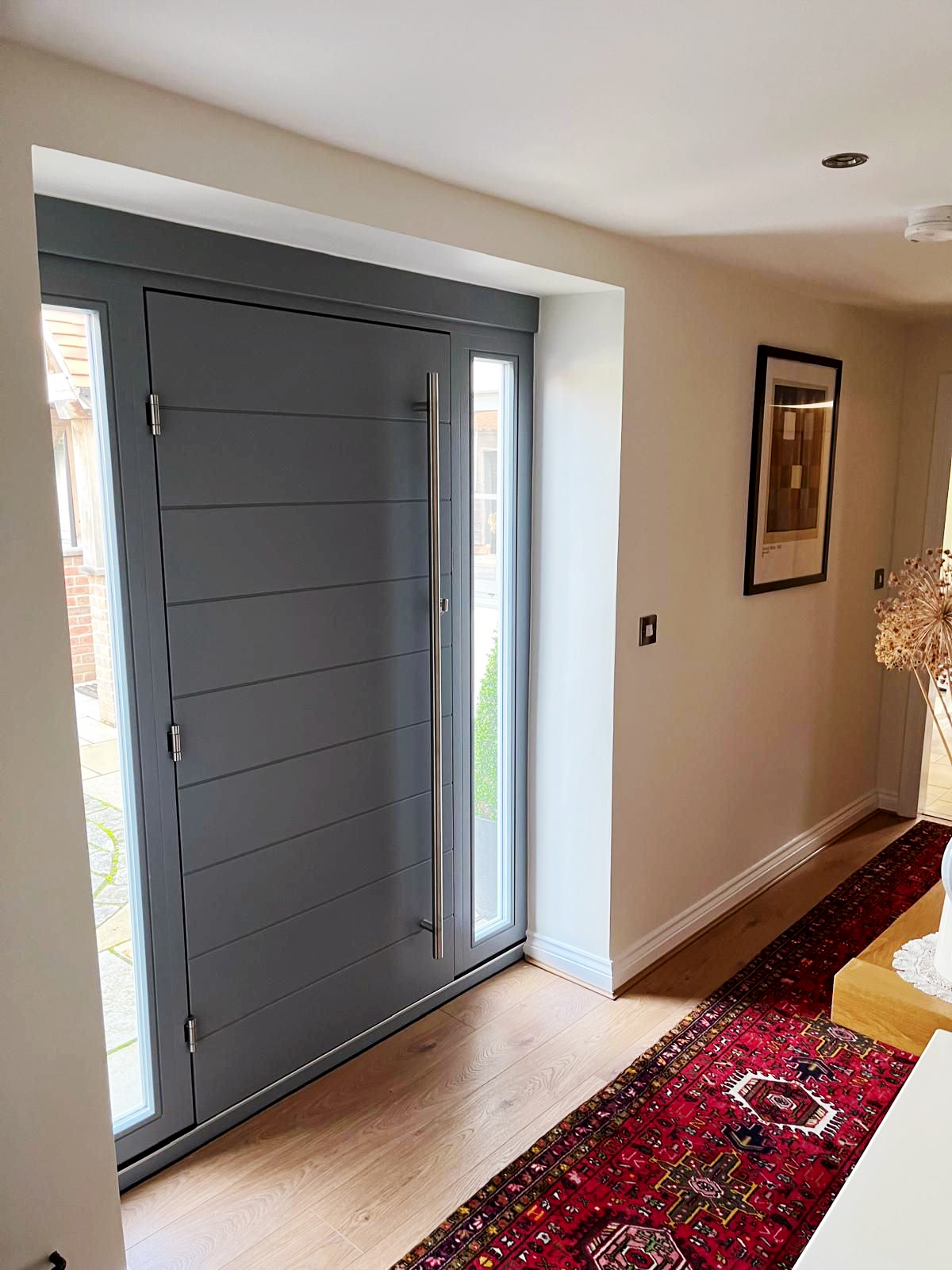 To complement the existing windows, the clients selected a Silver Grey Satin RAL 7001 finish on both the new doors and the fixed window. For the porch door, one of Bereco’s boarded panel CL7 Contemporary Flush Entrance Door designs, they opted for a classic, timeless look with our Polished Chrome Balmoral Lever handle, matching the home’s overall style.