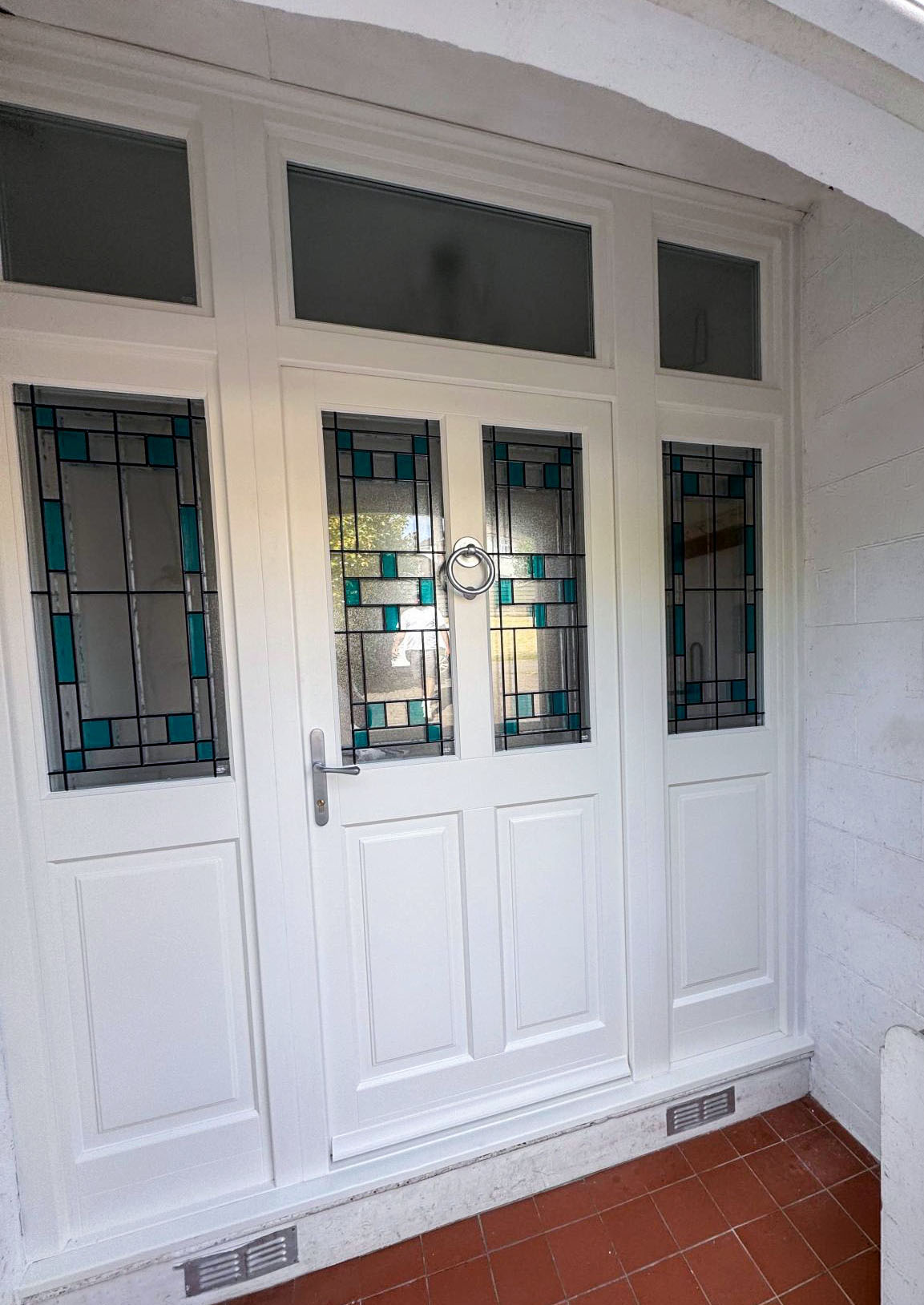 For glazing, they selected Stippolyte obscure glazing for privacy, enhanced with decorative leaded lights and blue-coloured glass inserts. To achieve this, the specification was upgraded to triple glazing, ensuring both beauty and performance. We created something completely unique for this project; a triple-layer lead arrangement, with Antique Black lead externally to suit the exterior aesthetic and Platinum Silver internally to complement the interior décor. Further collaboration refined the coloured glass elements, with swatches in soft blues and greens supplied so Jonathan and Claire could choose their favourite shade and decide exactly where the colour should appear within the decorative design.