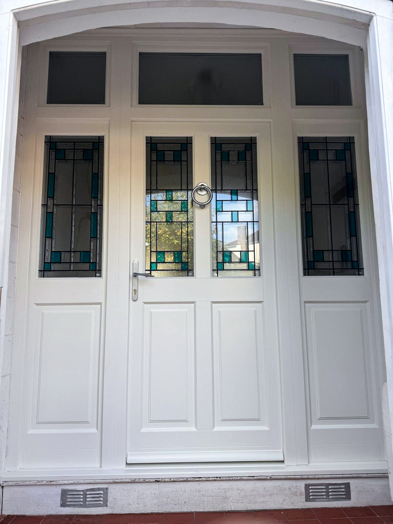 During the survey, our installation team identified an issue with the proposed factory coupling due to the recessed entrance and a curved brick arch. Thanks to our team’s extensive product knowledge, we adapted the plan so the door leaf, sidelights and fanlight would be site-coupled, ensuring each component could be positioned perfectly within the limited space.