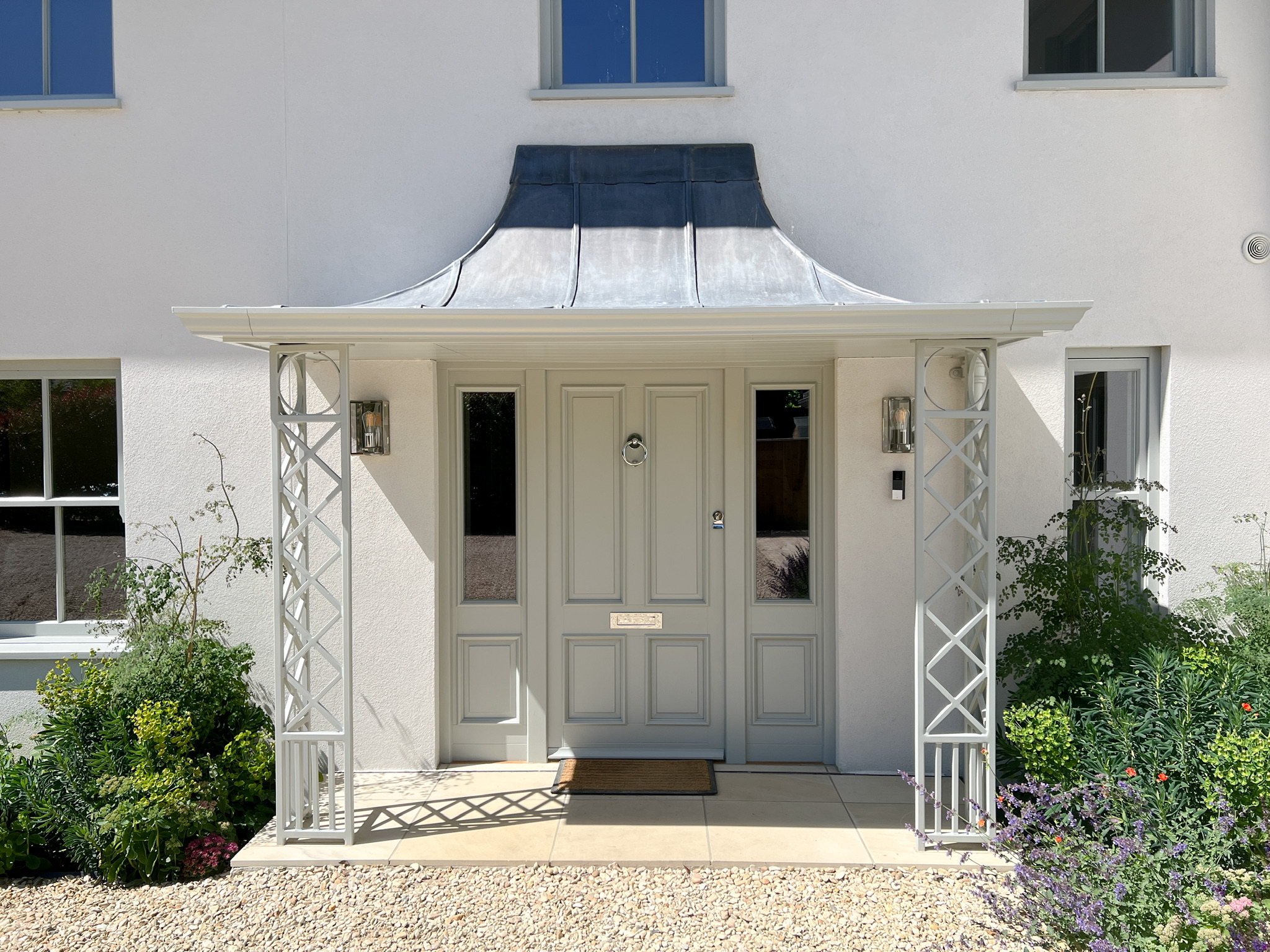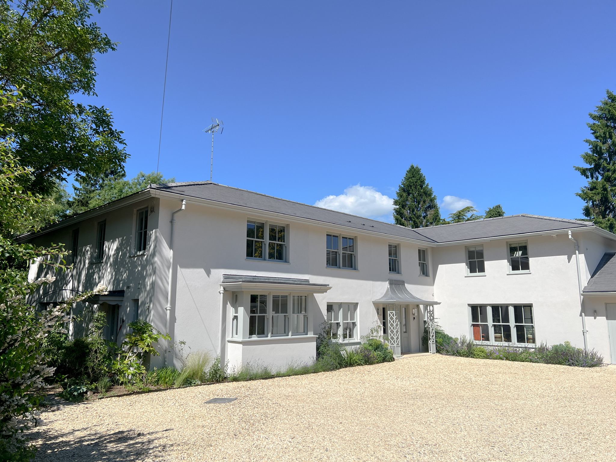 The Agate Grey RAL 7038 finish on the Traditional Sliding Sash Spiral Balance and Flush French Doors were specifically chosen to transform the house from its 1960’s appearance to a modern take on a Georgian property, the colour beautifully contrasting against the White render.